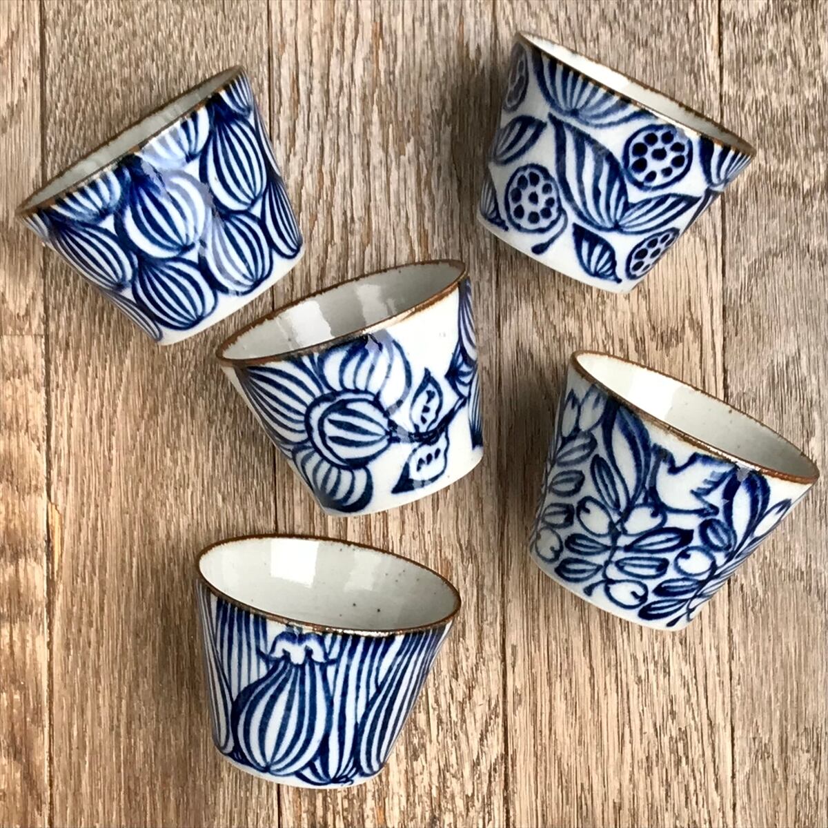染付(そめつけ)と呼ばれる技法で1点1点絵付けをし、フチに鉄絵の具を塗ってアクセントにしてあります。この絵の具の色の出方、流れ方は1点1点異なります。